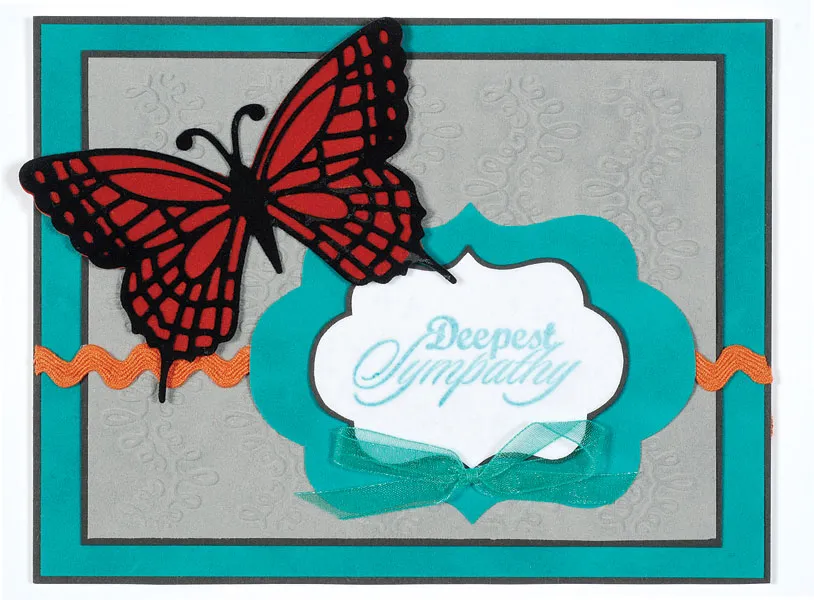 Use the template to trace and cut a 4”x3” teal label. Trace and cut a white 1 1/2”x2 1/4” inner label and mat on black with 1/16” borders. Stamp “Deepest Sympathy” with Deep Lagoon and glue to the teal label. Glue orange rickrack 1 3/4” from the bottom and glue the layered label 1/2” from the bottom and 3/4” from the right. Zotä a sheer teal bow to the bottom of the label.