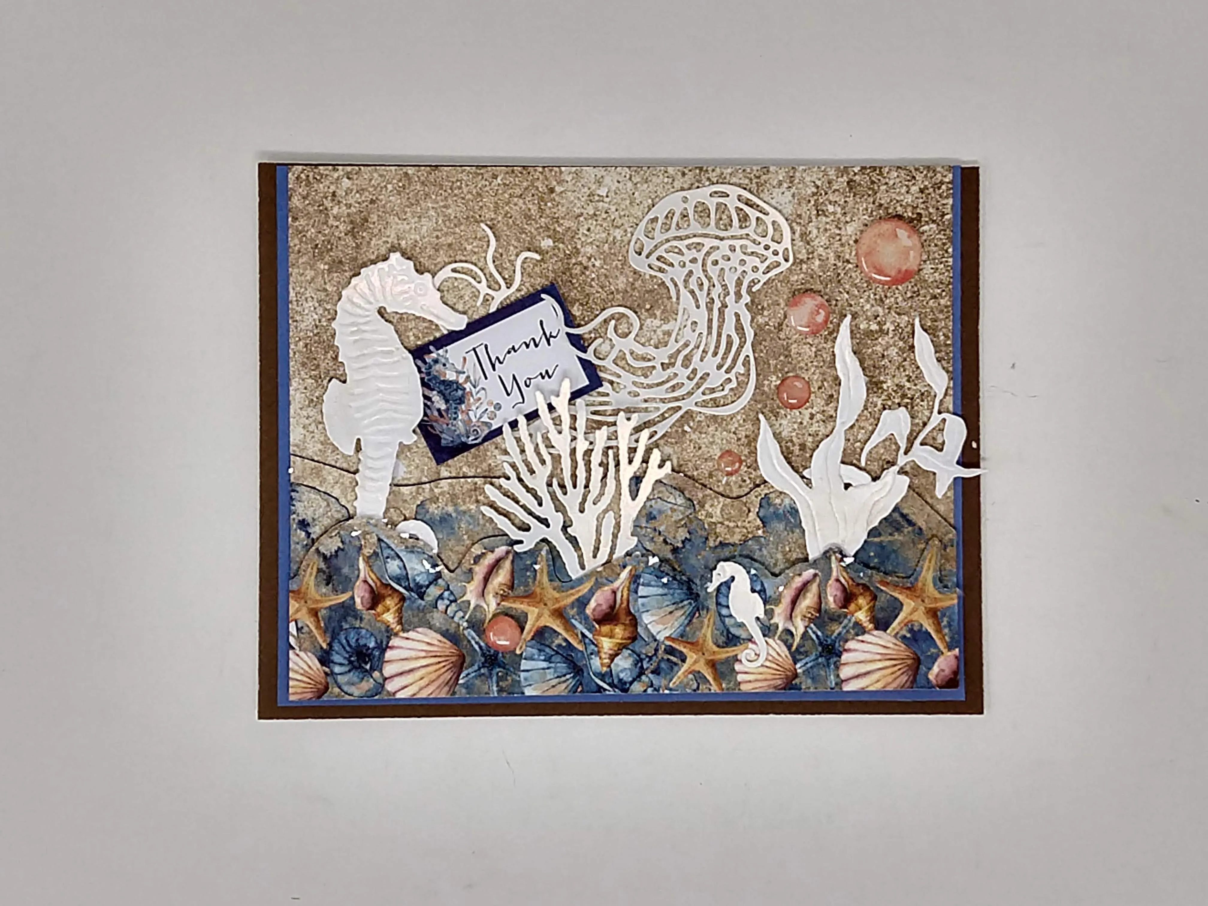 Die cut many Seascapes pieces from white cardstock and go over with the Copper Opal Polish. Remember to spritz water before you close the jar. Glue and foam tape the pieces as shown with the jellyfish holding the sentiment cutout. Add Wishing Bubbles as shown.