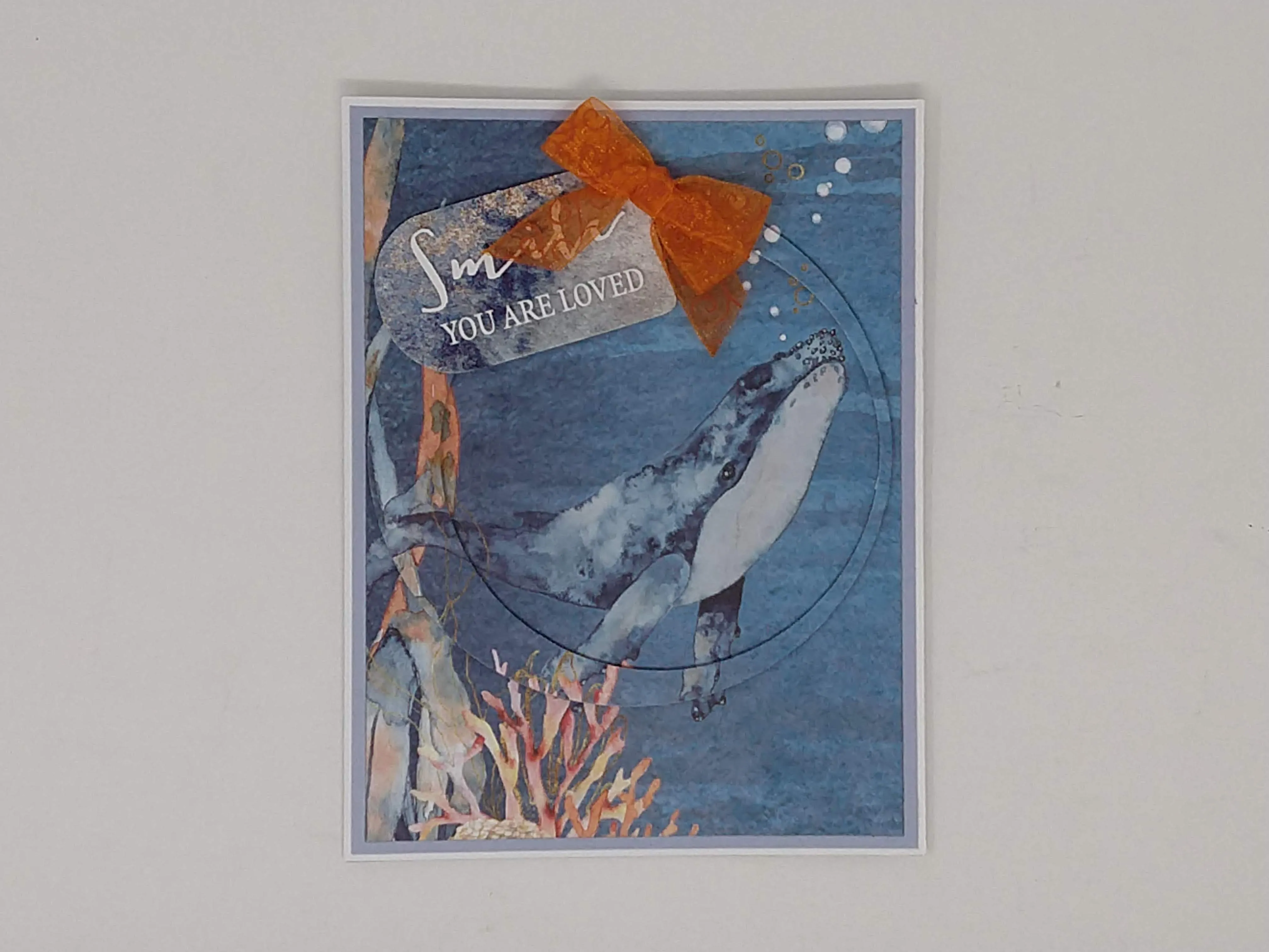 Use the two largest not scalloped circles and place over the other whale paper to cover the majority of the whale with the largest and off center with the smaller circle to show most of the head. Run through the Gemini. Match up the images and foam tape in place. Glue the Smile die cut piece to the top and Zot™ an orange 2” wide bow as shown.
