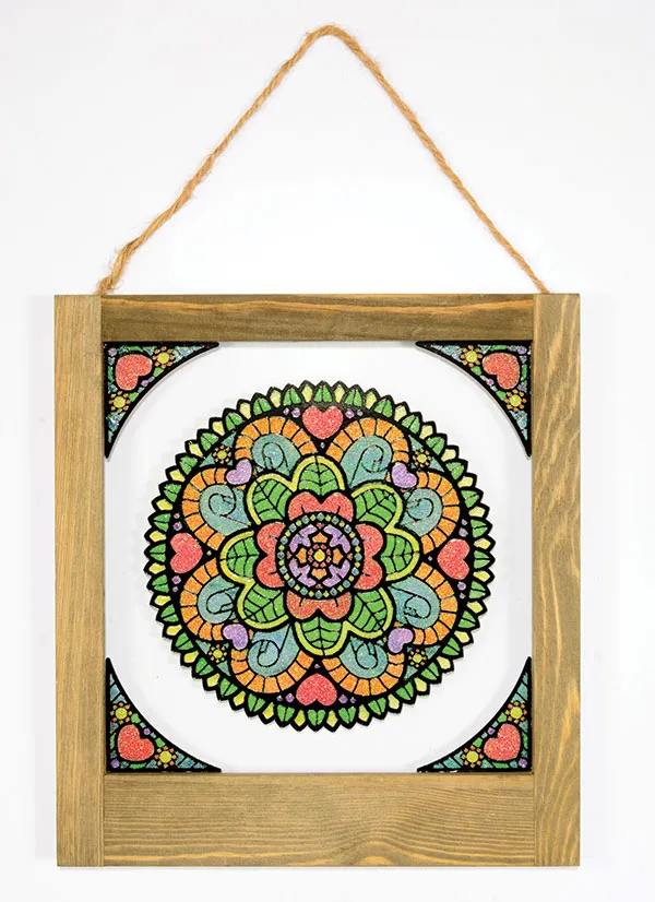 Use a flat screwdriver to lift the prongs on the back of the hanging window. Remove the back and the glass. Set aside the back for another project. Use a paper towel moistened with rubbing alcohol to clean the glass. Apply extra sticky tape on the edges of the back of the window frame. Place the glass centered on the window so it is secured by the tape. Bend the metal prongs back over the edge of the wood frame. Turn the piece over.