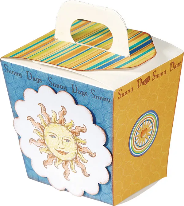 Punch a scallop circle from white cardstock and stamp a sun at the center. Use the cotton swab to apply brown ink to the scallop edges. Use pencils to color the eyes blue, mouth orange, surface yellow and rays orange and yellow. Foam tape to the front of the box.