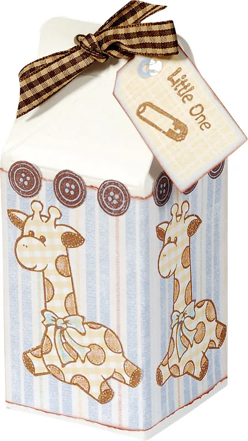 Hold the top of the carton together and punch two 1/8” wide holes about 1” apart. Thread the ribbon though the holes and tie a bow. Stamp “Little one” on the small yellow tag and a diaper pin under the words. Glue the tag under the bow.