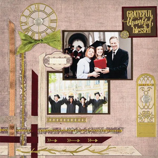BACKING THE DAZZLES™ WITH VELLUM Both pages: Place the two large arched windows and the large clock on vellum. Cut close to the Dazzles™ edges. Left page: Glue one window 1/8” from the right and 1½” from the bottom. Glue the clock ¼” from the top and 1½” from the left edge. Right page: Glue the second window 1/8” from the left and 5/8” from the top.