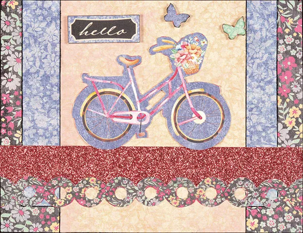 Place a strip of self-adhesive glitter ribbon across the card, 1” from the bottom edge. Glue a length of border die-cut across the bottom edge of the gltter ribbon as shown and trim even with the card edges. Glue the bicycle die-cut and foam tape tiny butterflies as shown. Foam tape the “hello” cut-out to the top left.