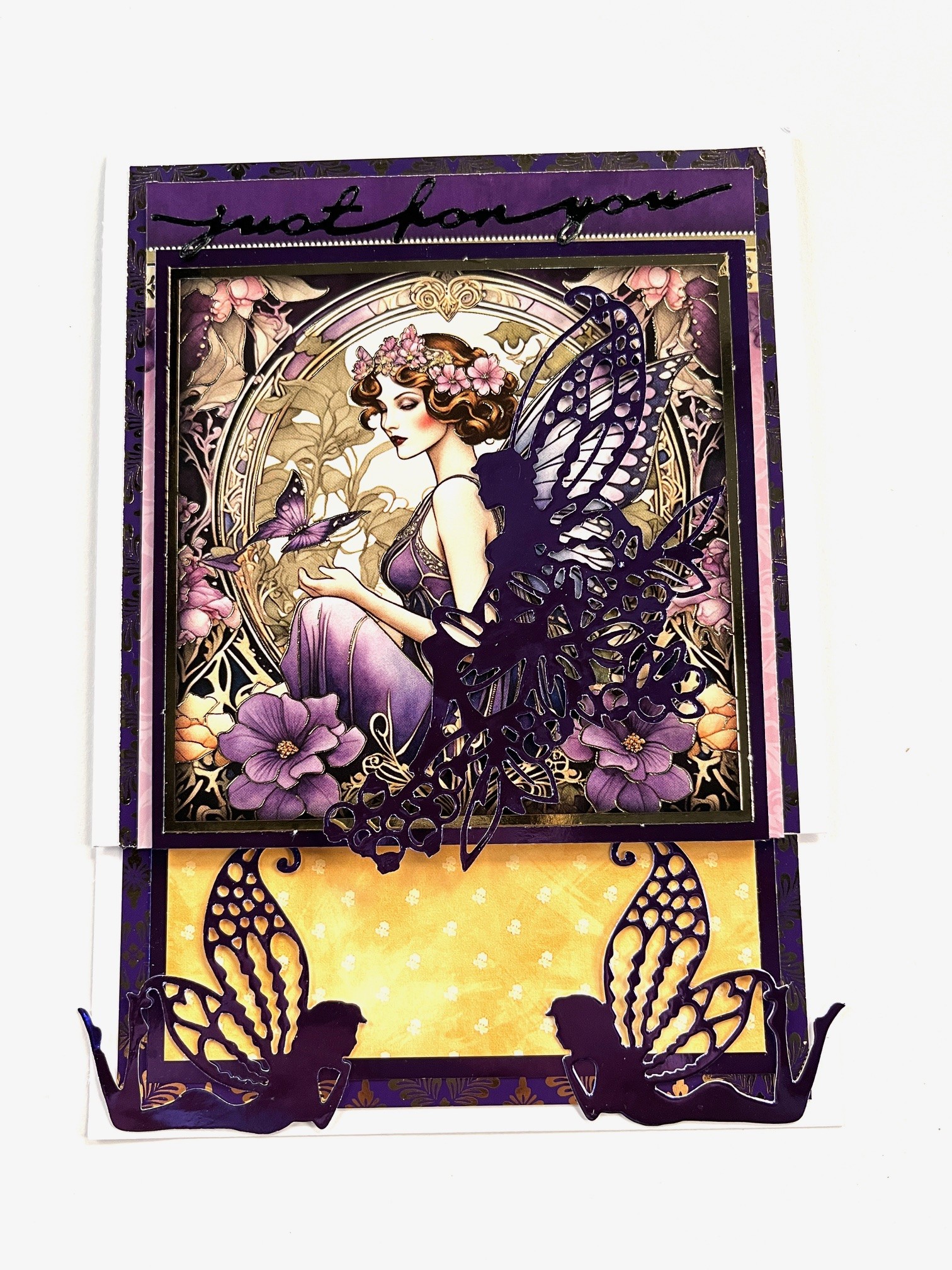 Use the fairies dies with purple Mirri. Die-cut a small fairy from the back side to get a reverse image. Glue the body of the large Fairy to the purple fairy as shown. Place “Just For You” Dazzles™️ at the top.