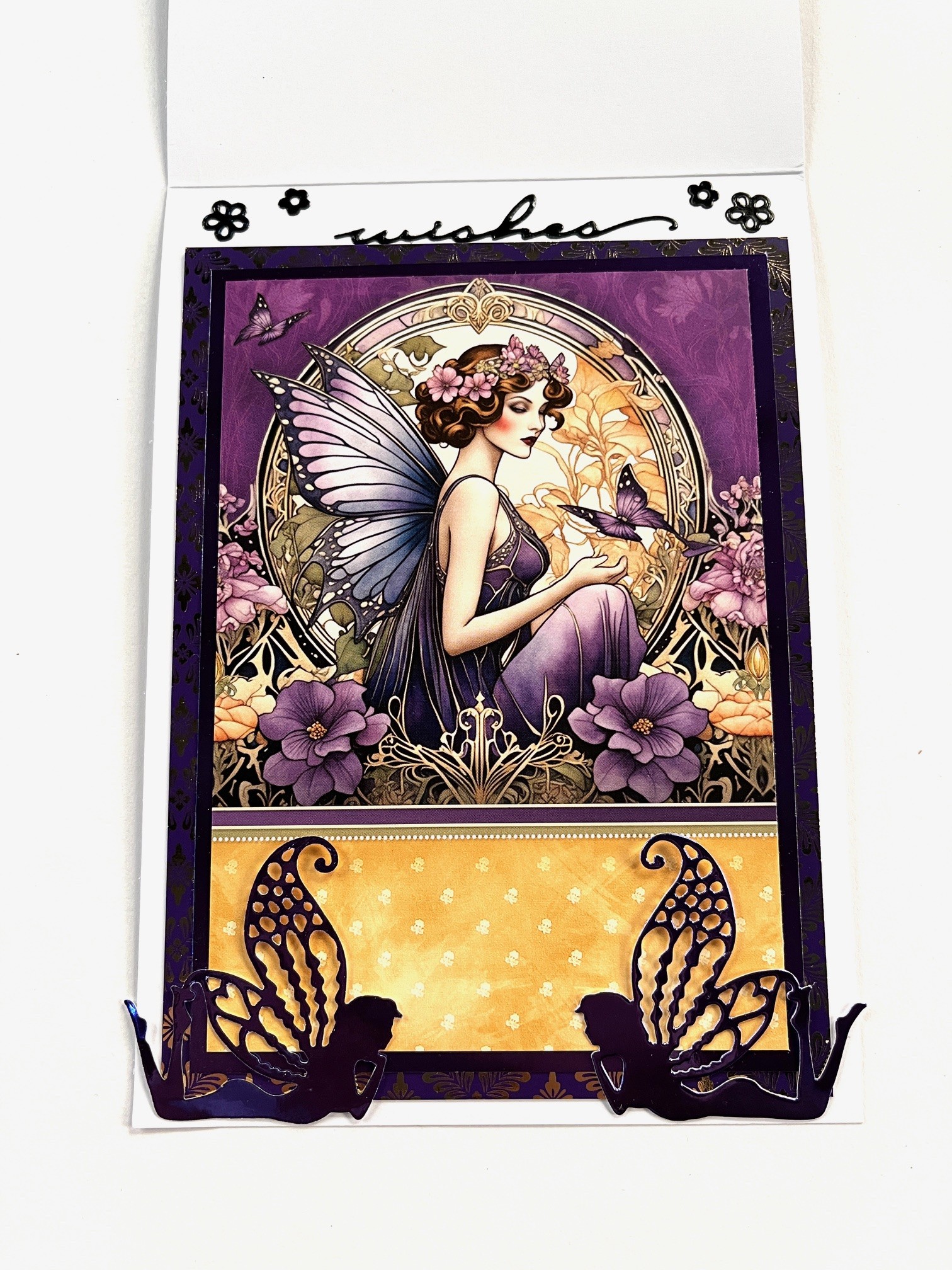 Card inside: Cut 4”x5 ½” purple fairy Adorable Scoreable. Mat on purple Mirri leaving 1/8” purple borders. Mat again onto purple Edge-to-Edge leaving 1/8” Edge-to-edge purple borders. Tape 1/8” from bottom, left and right sides. Place “Wishes” and flower Dazzles™️ at the top. Glue small fairies facing each other in the bottom corners.