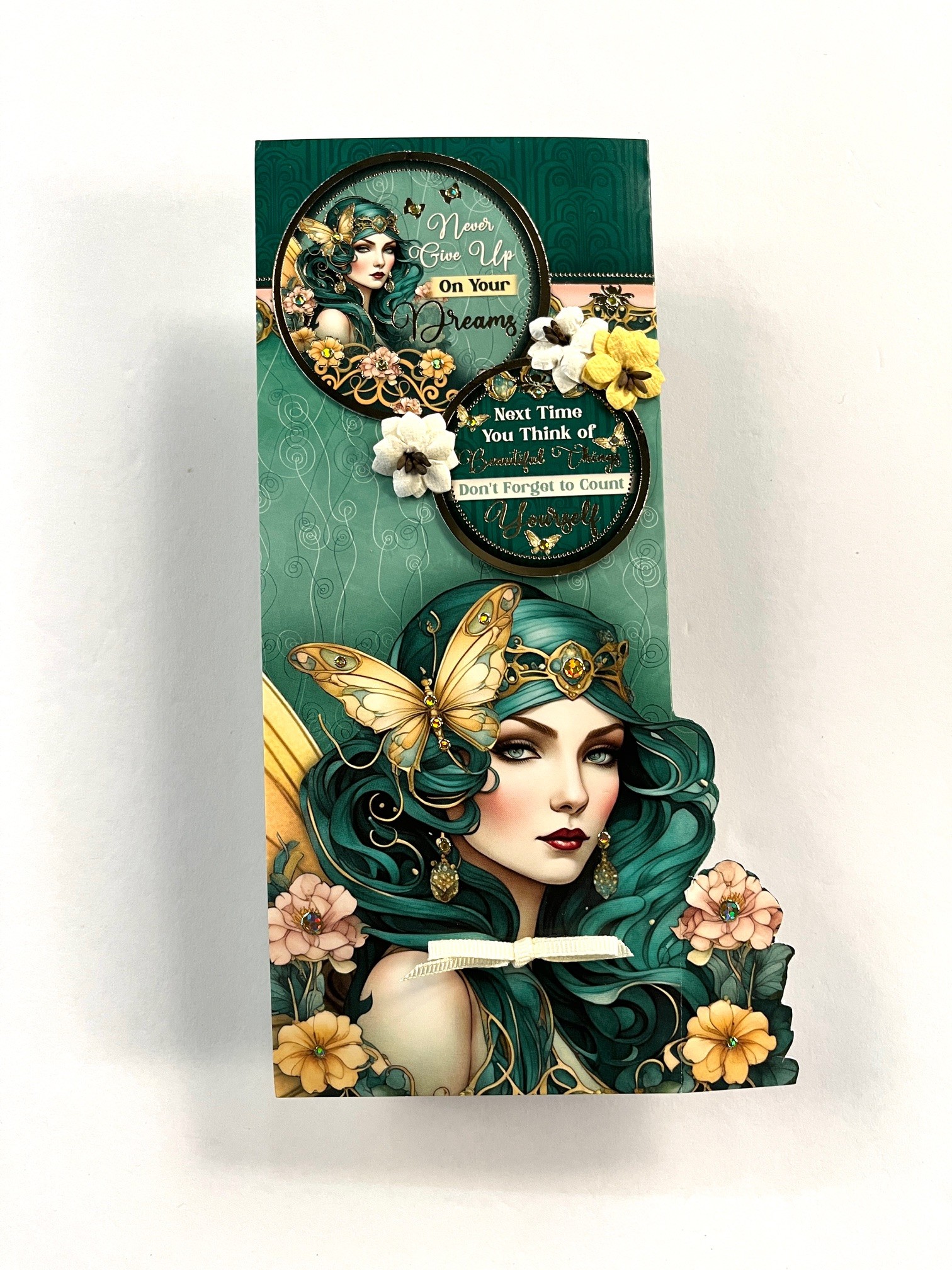 First panel: Glue “Never Give Up” Topper in the top left corner. Foam tape “Next Time You Think of Beautiful Things” Topper below it and to the right. Glue flowers as shown. Make and Zot a 2” wide ivory bow from the 1/8” Ribbon Set and place on the fairy’s neck. Place gold Dazzles™️ as shown.
