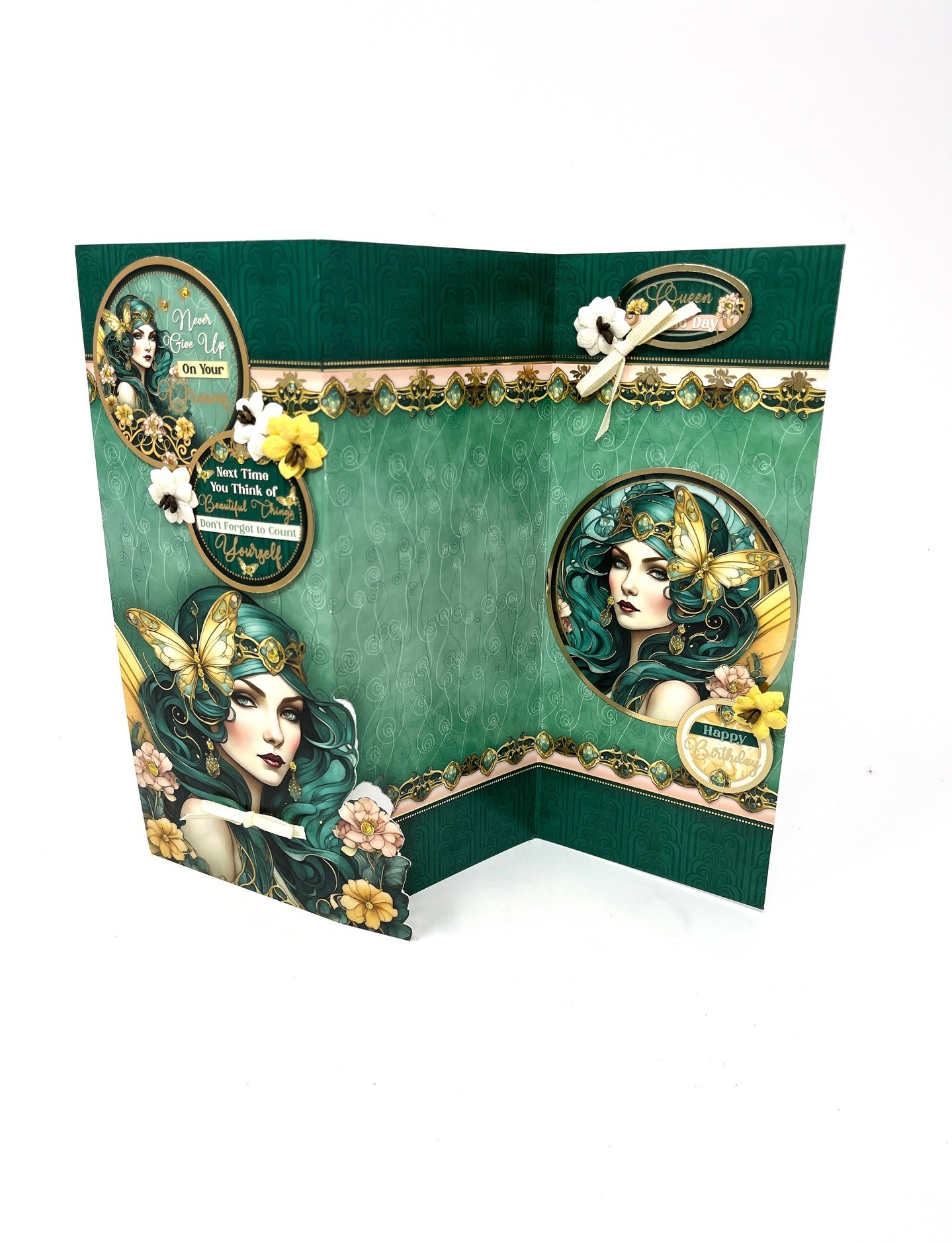Select the green fairy Adorable Scoreable and cut along the flowers and her hair on the right side. Place on scoreboard. Score at 3 1/2” from each end being careful not to score the fairy. Then fold in a mountain/valley pattern as shown.