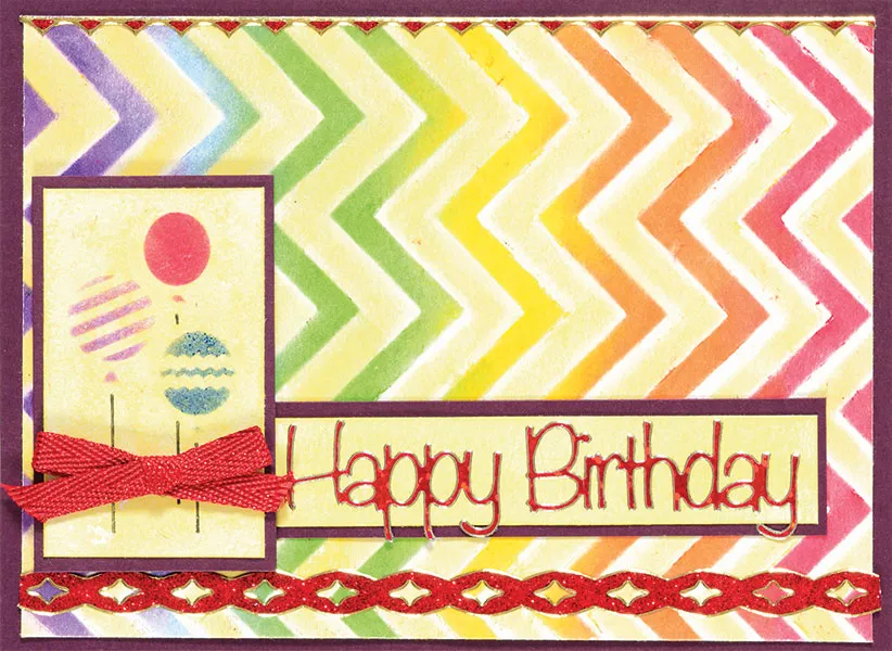 Color a 4½”x3/4” white cardstock with Butter Cream Gelato. Mat on a Purple cardstock with 1/16” borders. Place the “Happy Birthday” Dazzles™ to the right of the paper, and foam tape ¾” from the bottom. Color a 1½”x2½” white cardstock with Butter Cream. Use the Balloon Stencil and color the balloons with Red Cherry, Blueberry, & Grape Gelatos. Draw the strings with the black pen. Zot a red bow on the strings. Mat on Purple cardstock, and Foam tape on the right edge, overlapping the Happy Birthday paper. Place a Red Dazzles™ along the bottom ¼” from the bottom. Place a Red Jewel Dazzles™ along the top border.