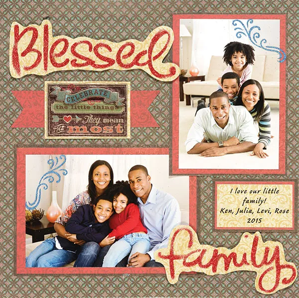 Mat photos on Family Ties red paper with 3/8” borders. Mat again on Family Ties brown paper with 1/8” borders. Use the swirl stencil, squeegee, and the Perrywinkle Sparkle Texture Paste to make swirls on the photo corners as shown. Glue one horizontal photo on the bottom left corner 1” from the bottom. Overlap, and glue the vertical photo on the top right corner ½” from the top.