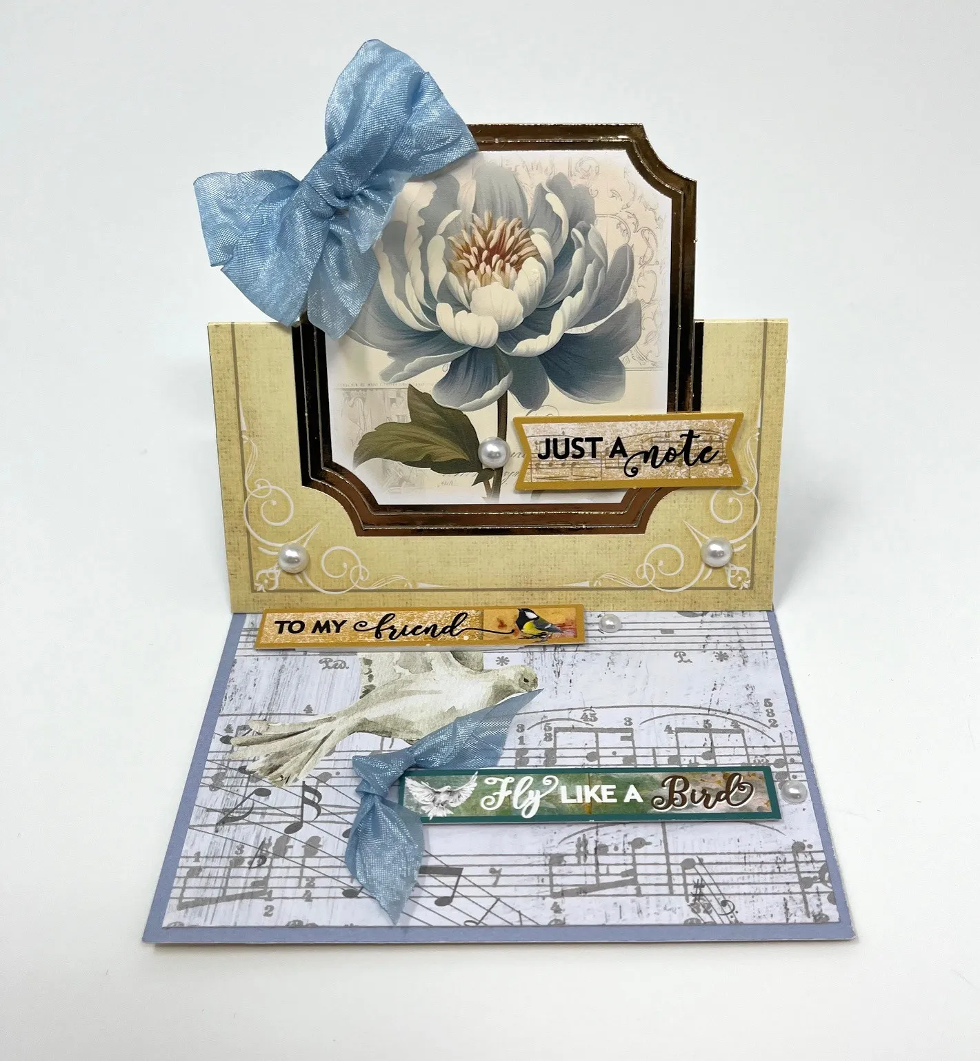 Cover the inside card with light blue cardstock. Cut a 4 1/2" square Song Birds 12x12 patterned music and dove cardstock and glue on to card inside. Foam tape the "To My Friend" (1 ½” from the fold) and "Fly Like a Bird" (1” from the bottom) Song Birds die-cuts as shown. Place a pearl at the right end of each one. Zot™️ a 1 1/2" light blue knotted ribbon as shown.