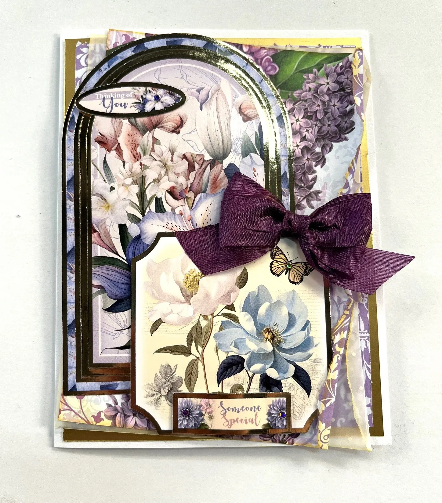 Select the arch Topper from the Fancy Florals sheet. Glue the outer and middle frames directly to card front matching the gold paper on the top and left edges. Use two layers of foam tape to secure the inner image. Glue the "Thinking of You" sentiment from the same Topper sheet at the top left as shown. Glue the fancy cornered Topper from same sheet over the bottom right corner of arched image with glue and foam tape. Zot™️ the "Someone Special" sentiment to the bottom of the Topper using foam tape in the center. Make and Zot™️ a 2" wide purple bow in the top right corner of the bottom Topper. Place Jewel Dazzles™️ as shown.