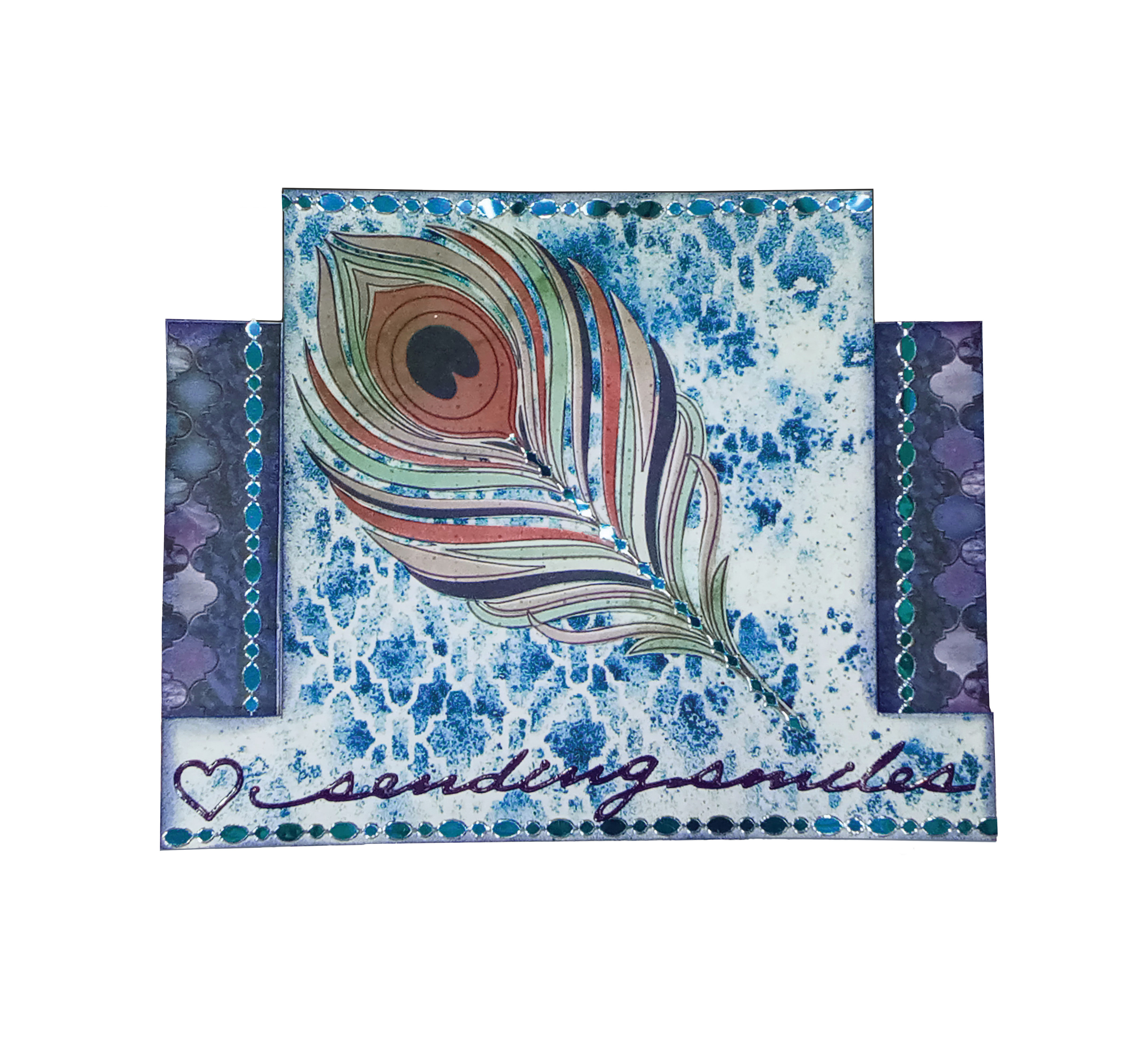 Place the paper in the MISTI Stamp Positioner. Place the stamp over the stenciled image, lining up the centers, and stenciled portions of the feather. Ink the stamp with Prussian Blue ink. Stamp the feather image. Cut close to the feathers outer edge. Cut between the feather sections. Foam tape to the card center, and place a Dazzles Spiked border in the center.