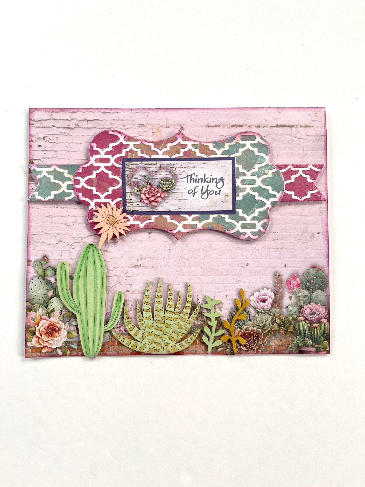 Place the Long Label cutting die so that it covers all 3 colors of the stencil butter. Place the other labels around the stenciled piece, making some of them solid colors, and some of them 2 or 3 colors. Cut in a Die Cutting Machine. Ink the edges with Lipstick ink. Layer as shown.