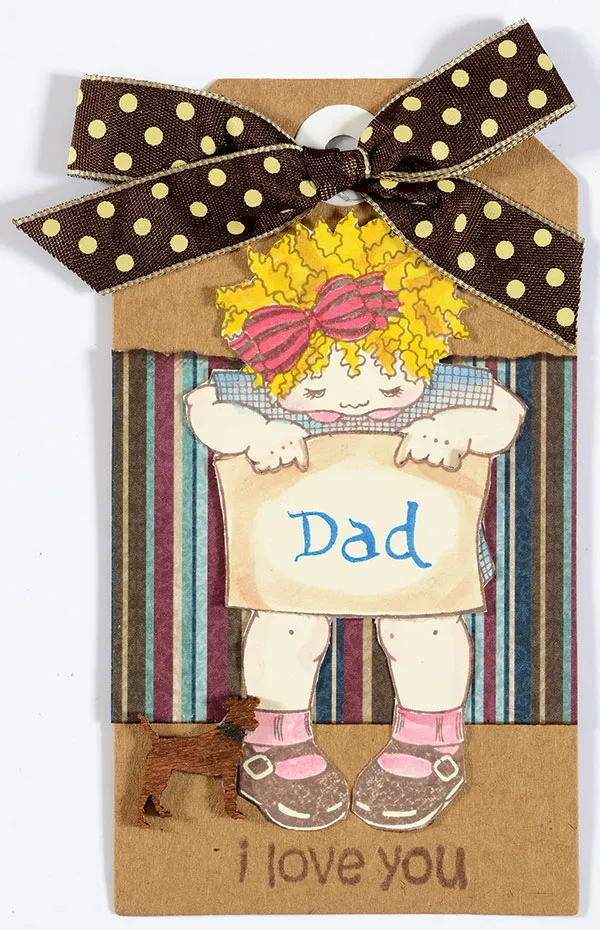 Tag: Tear the top edge of 2” wide Fresh Frost striped paper and ink torn edge with brown ink. Glue across the center of the Kraft Tag and trim paper edges even with the tag. Glue the Janie’s Girls stamped image to the tag and stamp “I love you” on the tag bottom. Use the brown Landscape Brush Marker to color the dog and let dry. Use the blue brush to draw a collar around the neck and glue to the tag as shown. Use ½” wide brown dot Stolen Moments Ribbon to make a bow and Zot the top of the tag.
