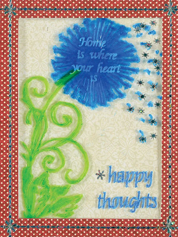 Cut a 5”x6½” acetate. Emboss it with the folder. Color the embossed pattern with the markers on both sides (this will make the color bolder). Glue to the back of the card front, centering the Dandelion in the frame. Place border Dazzles™ and flower Dazzles™ as shown. Color the “Happy Thoughts” Dazzles™ with the marker. It will take a few coats of ink. Place in lower right corner.