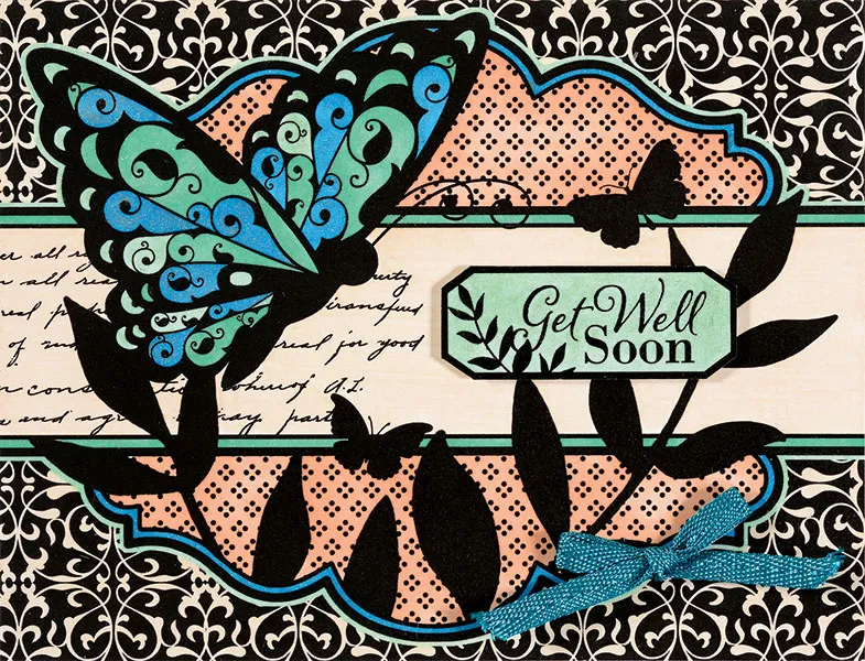 Place your card with the fold on the top. Glue the card topper even with the card front. Cut out the “Get Well Soon” label and trim the black edges to a 1/16” border. Color the inside of the label with the BT2 pen. Apply Clear Wink of Stella over the color. Foam tape the label on the card topper as shown. Use 1/4" wide teal glimmer ribbon to tie a bow. Zot™ on the lower right side of the card as shown.