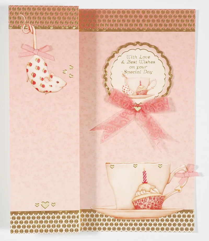 Card inside: Open your card, glue a 5” length of grosgrain 1” from the fold and trim the bottom end at an angle. Pop out the “Happy Birthday” and small mouse/teacup die-cuts and foam tape them as shown. Zot™ a small grosgrain bow above and place Dazzles™ on the ribbon.