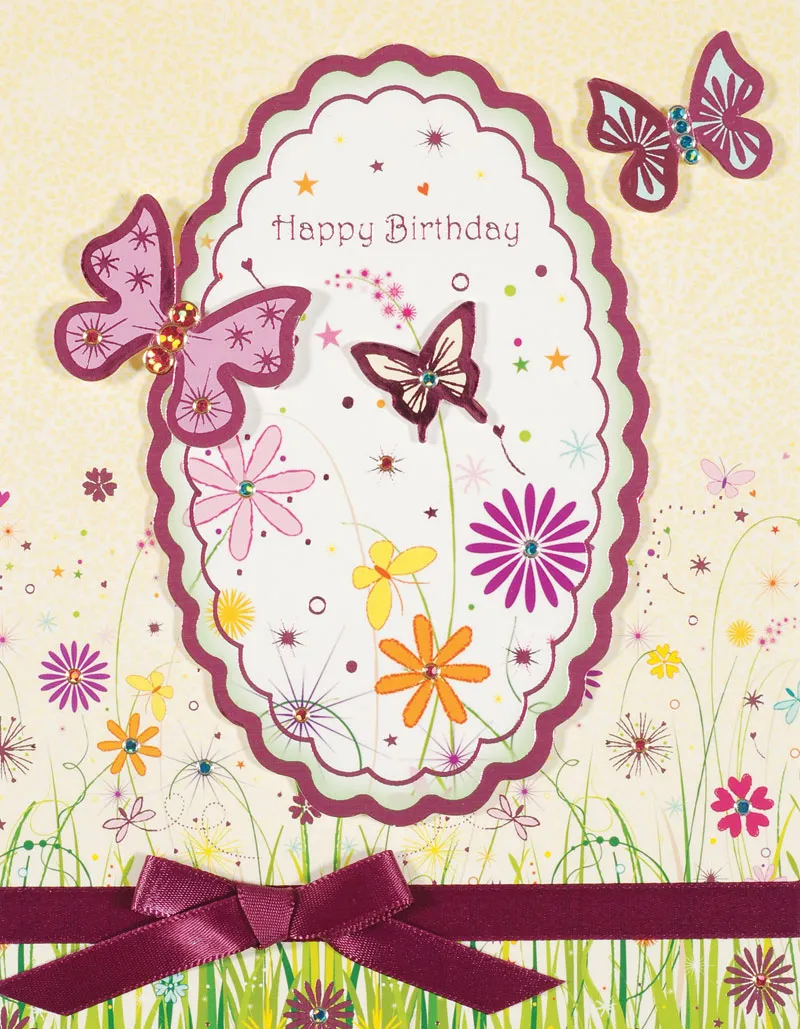 Card front: Place your card with the fold at the left. Cover the card front with Lovely Ladies yellow/pink/green flowers and butterflies foil cardstock. Foam tape the “Happy Birthday” oval die-cut centered on the card, 1/4" from the top.
