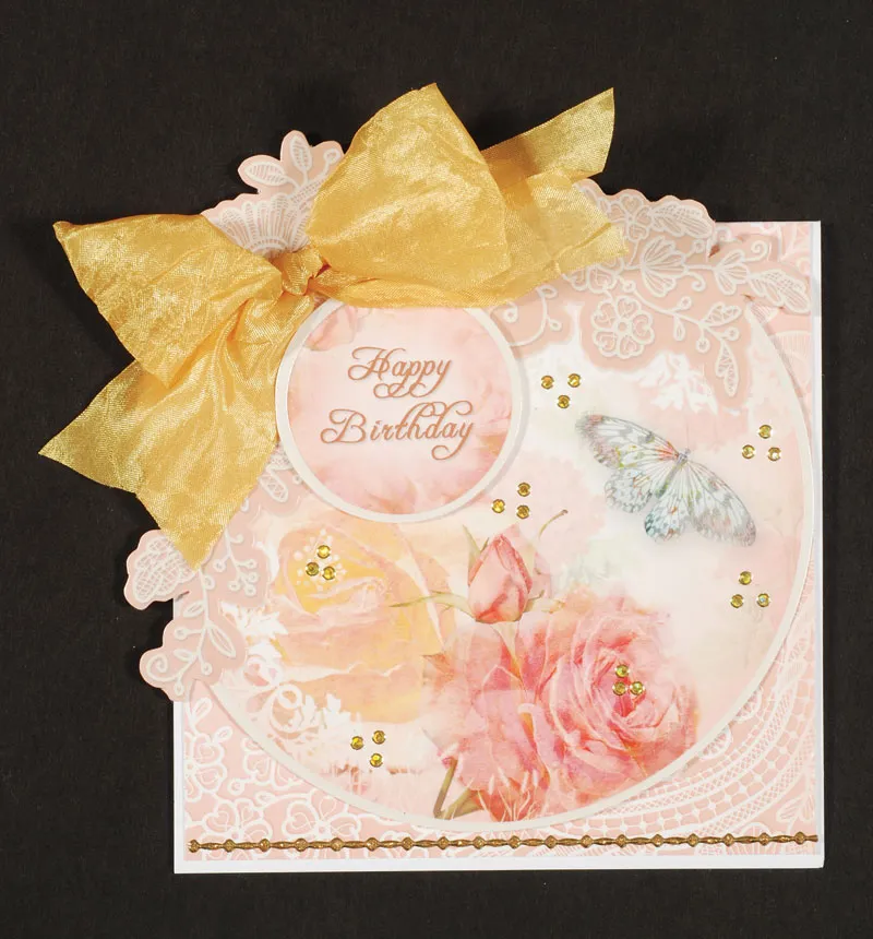Glue the large die-cut circle1/4” from the bottom, with the lace extending off the top left corner. Foam tape the “Happy Birthday” circle to the top left and use 1 1/2” wide yellow ribbon to make a bow then it Zot above the small circle.