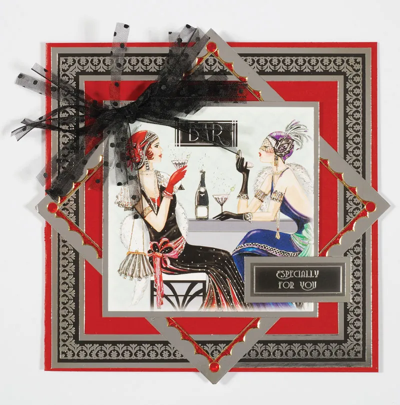 Place lengths of Red Jewel Borders Dazzles™ around the inside edge of the silver frame piece with Jewel Dazzles™ at each corner. Glue the frame on point to the card front. Foam tape the square die-cut piece at the card center. Foam tape the “Especially for You” greeting die to overlap the bottom right corner.