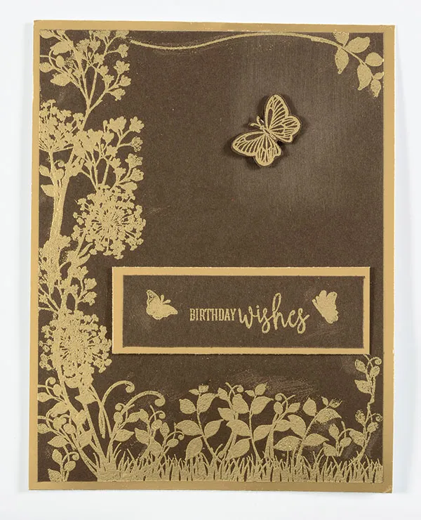 Stamp the sentiment in VersaMark™ ink on a 3¼”x1” dark brown cardstock. Stamp two small butterflies as shown. Heat emboss with gold embossing powder. Mat on gold metallic paper with 1/8” borders. Foam tape 2 ¼” from the bottom, and ¼” from the right. Stamp a large detail butterfly on a separate piece of dark brown cardstock. Heat emboss with gold embossing powder. Cut out, and foam tape on the top right. Glue centered on the card front.