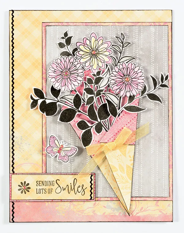 Stamp 3 detailed flower blossoms, 1 detailed butterfly, and some foliage images, stems and leaves onto white cardstock with black ink. Cut out each image, leaving a thin white border on each. Use the #108 pencil and a wet paintbrush to paint the center areas of the butterfly and daisy centers yellow. Add yellow to a larger area of the remaining flower blossom. Use the #123 pencil and a wet paintbrush to add pink color to the remaining areas of the butterfly and flower blossoms. Use the #273 pencil and a wet paintbrush to color the open leaf images gray.