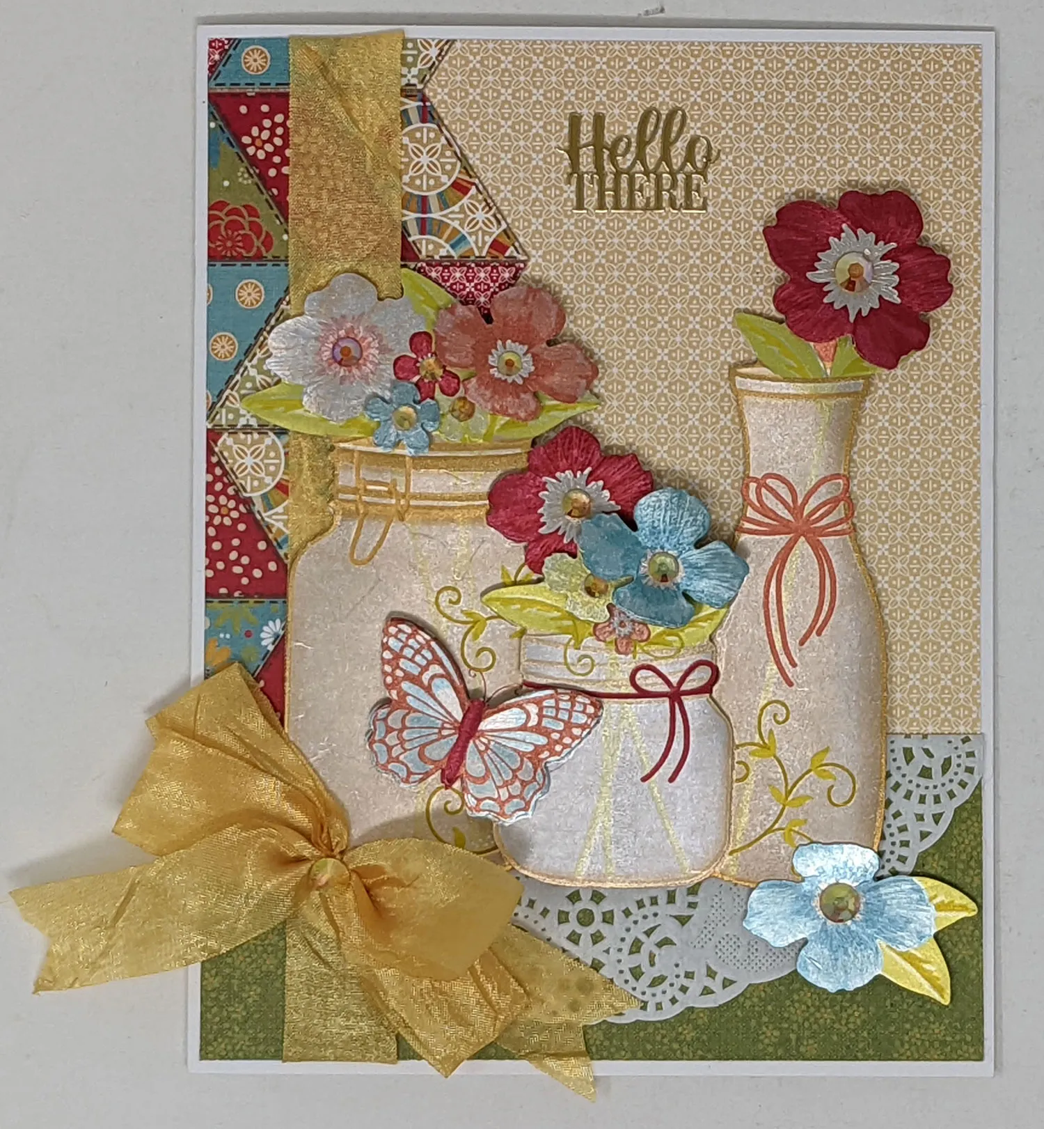 2. Wrap yellow crepe ribbon vertically on the paper, ½" from the left edge, and glue the ends to the back. Glue the paper centered on the card front. Construct the jar bouquets papier tole design with foam tape between the layers, then foam tape it to the front as shown. Foam tape the extra art blue flower die-cut at the lower right.