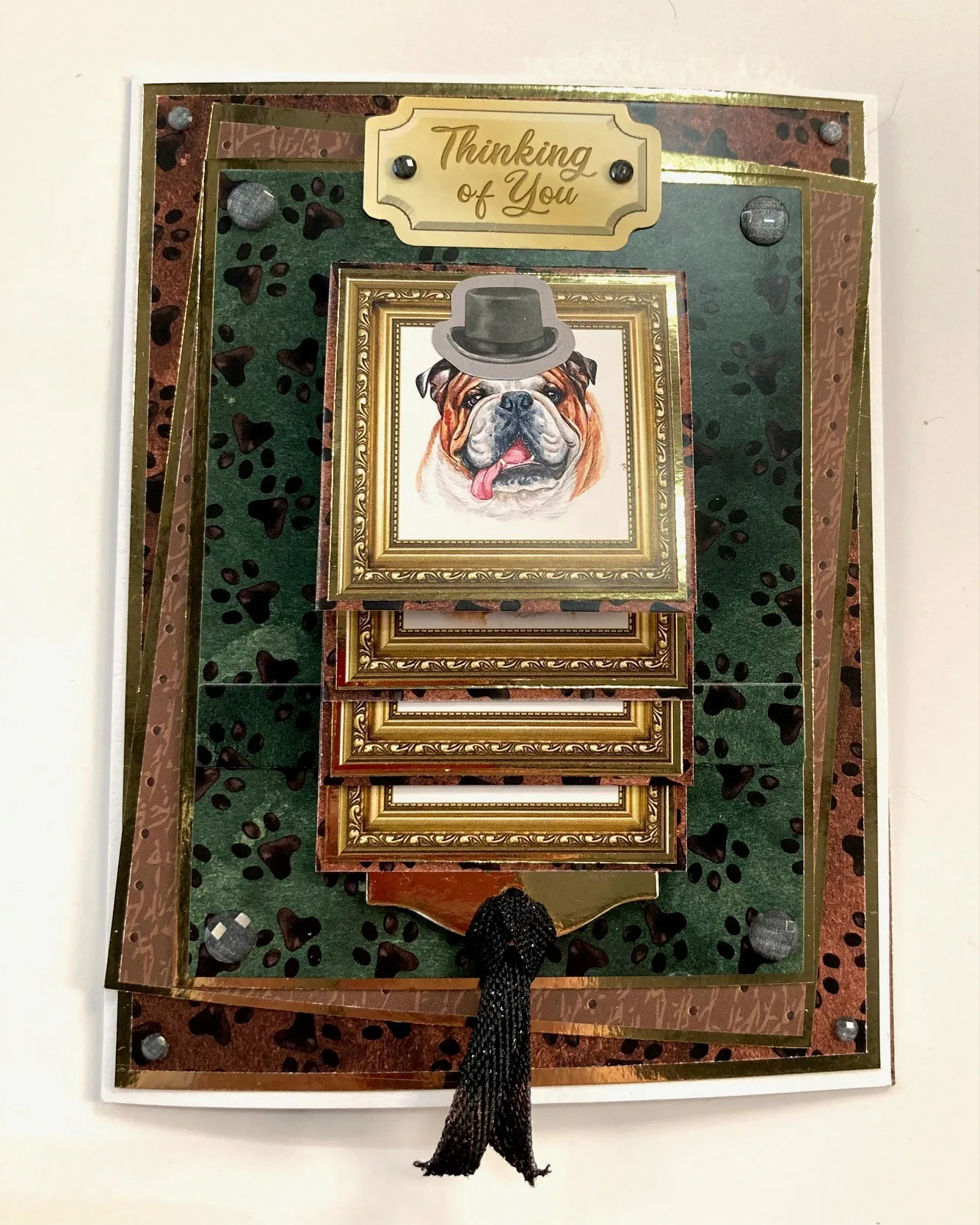 Cut out two framed dogs from the Picture Perfect Pad and mat on Mirri. Foam tape over the flip cards as shown. Make and Zot™️ a 1 1/2" wide black below each one. From the same sentiment sheet trim out "Best Wishes" and "Thanks so Much" and mat on Mirri. Glue 2" from top left and bottom right. Add Diamond Sparkles as shown.