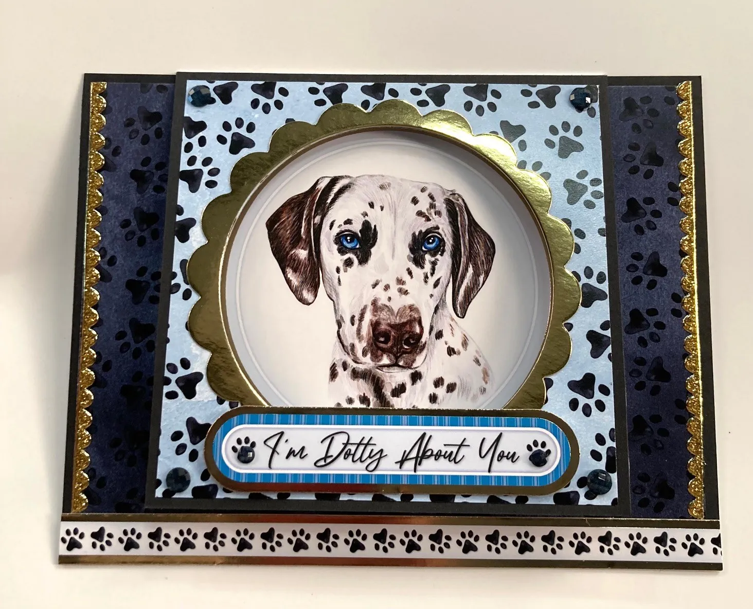 Card inside: Cover the inside with black cardstock. Cut a 6 1/4"x4 1/4" piece of dark blue patterned Adorable Scorable and glue leaving a 1/8" black border. Add Gold Jewel Border Dazzles™️ along the right and left edges of the blue patterned Adorable Scorable. Glue the paws Topper border along the bottom. Put glue on the back of the Dalmatian Topper and close card to wiggle the Topper into place behind the evacuated circle. Place Tiny Words and Phrases Dazzles™️ around the circle also adding Diamond Sparkles in between each one.