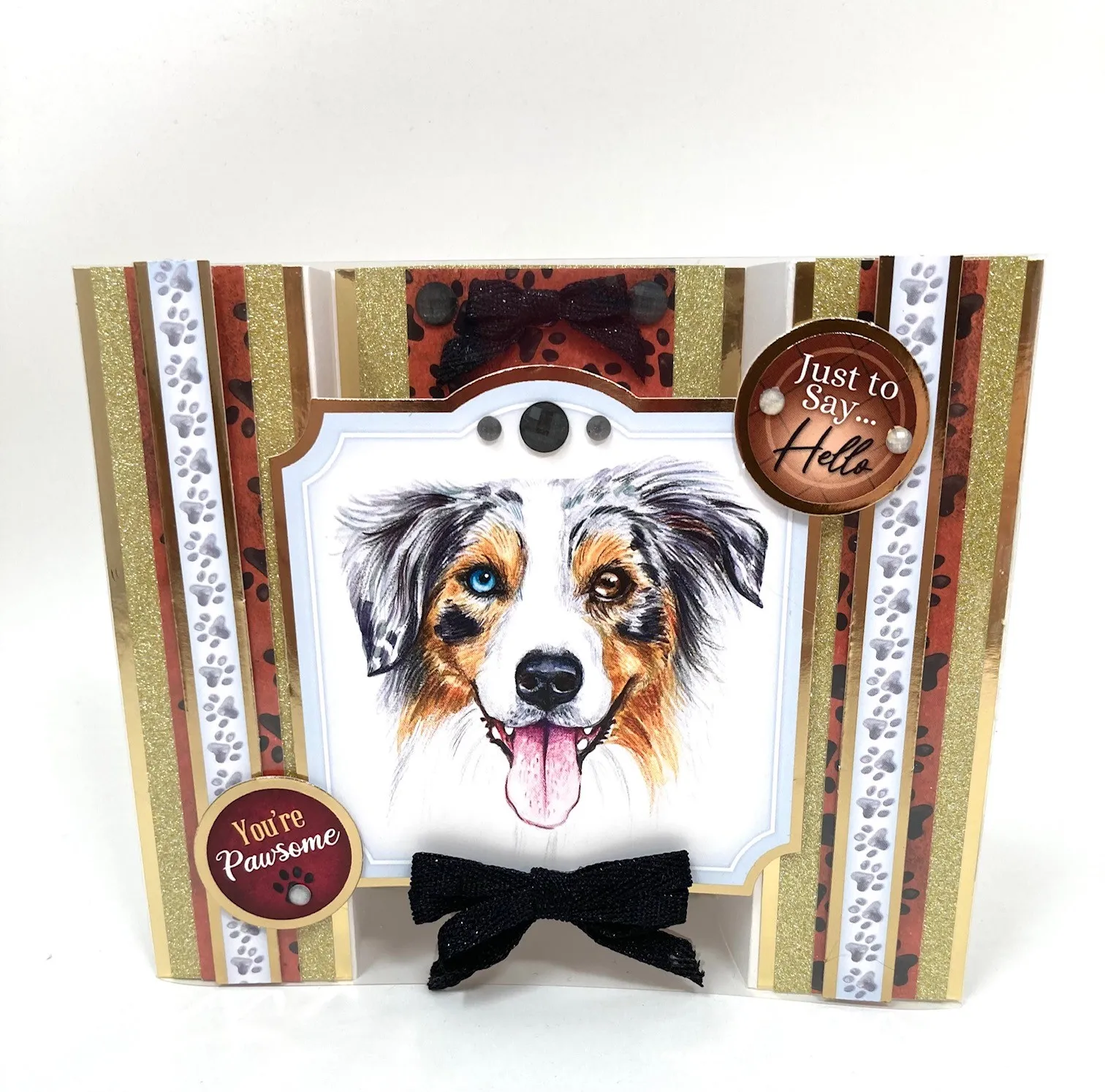 Cut two 5" lengths of the topper borders and use Extra Sticky Tape to place over the centers of the orange printed Adorable Scorable on top of the acetate on both sides. Use Extra Sticky Tape to secure the dog Topper in the center of the acetate. Foam tape "Your Pawsome" and "Just to say Hi" as shown. Make and Zot™️ a 2" wide bow to the bottom of Topper. Place Diamond Sparkles as shown. If desired, use Extra Sticky Tape to secure ½”x5” strips of the orange patterned cardstock over the acetate ends behind the card.