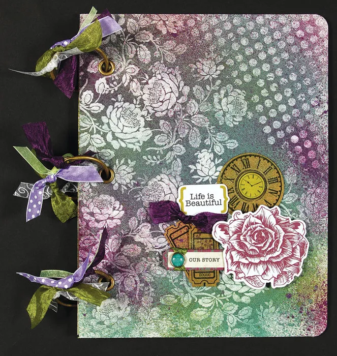 Using Wine Berry and River Mossy Smooch™ Spritz inks, mist the flowered resist cover of the canvas album. Dab a paper tower over some areas to create highlights. Let dry.