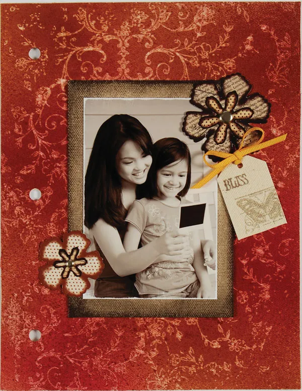 Create two layered flowers by gluing two layers of the papier tole together, then inserting a silver brad through the center. Glue a large one overlapping the top right corner of the photo. Glue the other flower overlapping the bottom left as shown.
