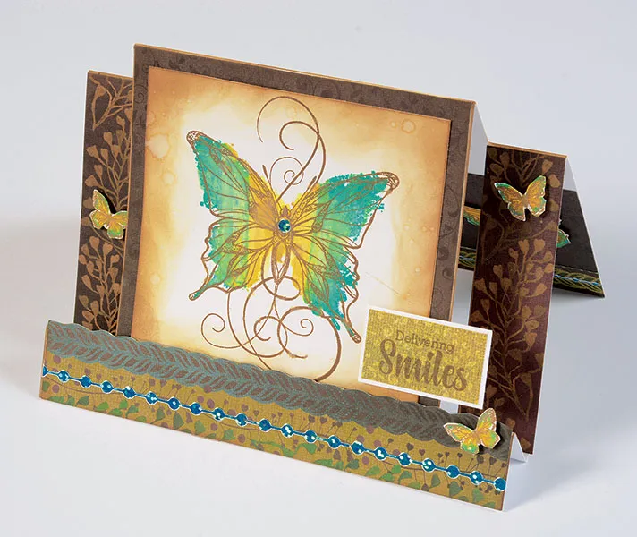 Ink the small red and purple circles background butterfly stamp with Wild Honey Ink. Ink the outside edges of the butterfly, with Peacock Feathers ink. Stamp on white cardstock. Stamp three butterflies this way. Ink the Red circle butterfly, and the purple circle butterflies with Vintage Photo ink, and stamp over the three yellow butterflies. Cut close to the stamped edge. Foam tape the three small butterflies on the side panels as shown.