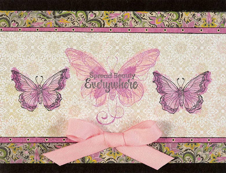 Card Front: Stamp the medium butterfly outline image on the center of 6 ½”x3” ivory paper, using dark pink ink. Stamp the medium solid image over the outline using light pink ink. Stamp a small solid butterfly image on the center using bright pink ink. Stamp 2 small butterfly outline images, using black ink, on either side of the pink butterfly. Stamp the solid image in light pink over the butterfly outline. Stamp the detail butterfly image in dark pink over the light pink. Use black ink to stamp “Spread Beauty Everywhere” on the center on the center butterfly.
