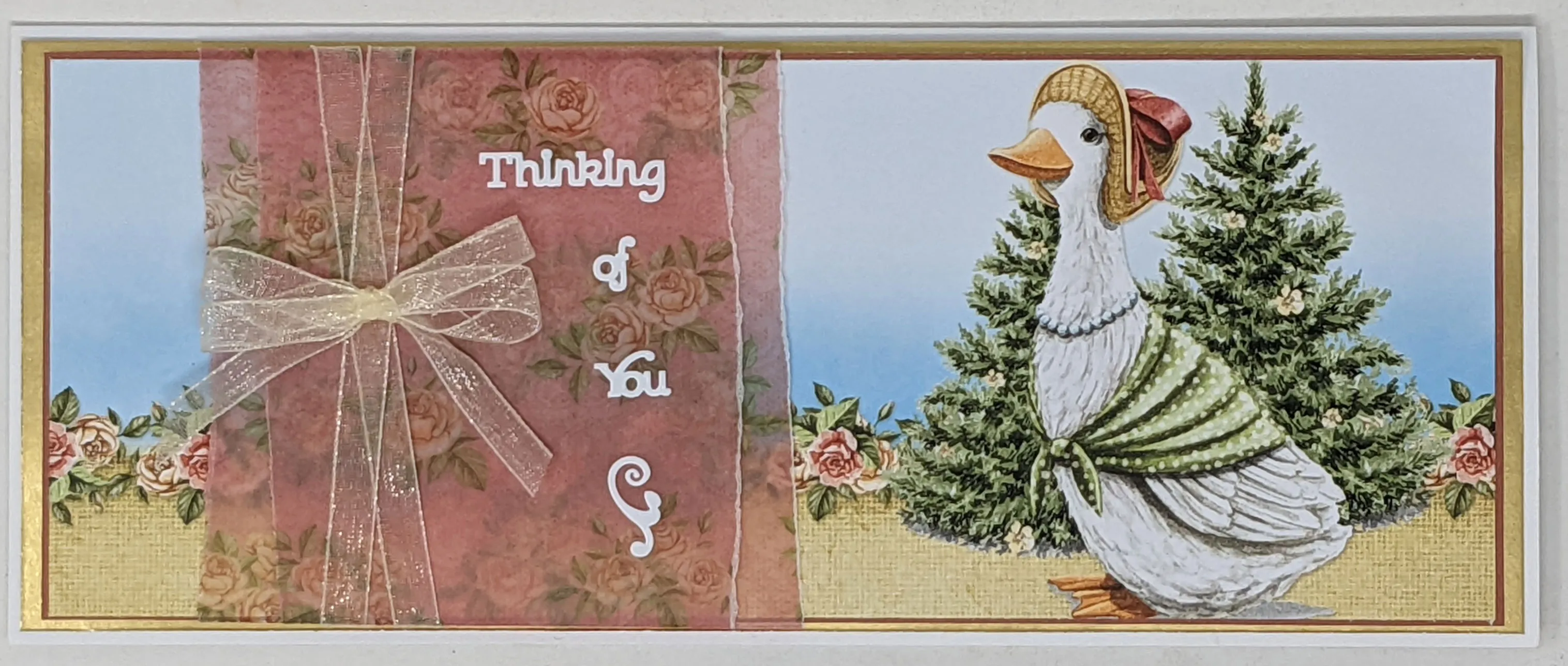Select the goose sheet from the 8x8 Paper Pad. Cut off the bottom just under her feel and cut it to be 3 ¼” tall. Mat on brown Matt-Tastic Adorable Scorable leaving a 1/16" border. Tear a 3 ¼” wide strip of rose parchment. Wrap around the goose image. Tear another strip 2” wide and place over the first parchment. Glue the ends at the back.