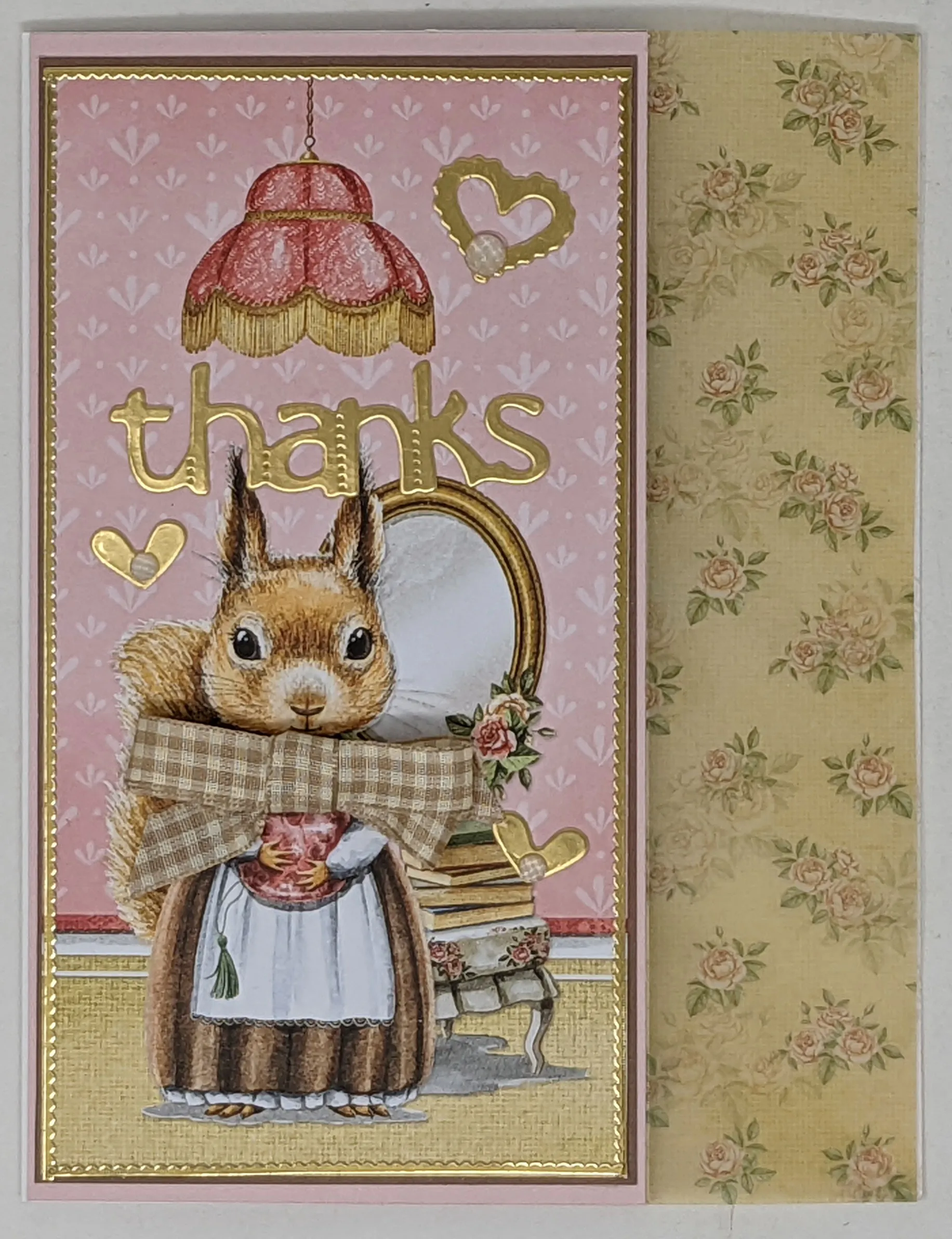 Cut 1 1/2" off the right side of the card front (fold is on the left). Cut 2"x6 ½” yellow roses parchment and glue so the parchment matches the full size of the card. Cut the squirrel page from the 8x8 Paper Pad and cut to 3 1/8”x6”. Mat on brown Matt-Tastic with 1/16” borders. Cover the card with pink Matt-Tastic Adorable Scorable. Glue the matted squirrel in the center. Outline the Squirrel piece with gold Thin Line Dazzles™️ stickers.