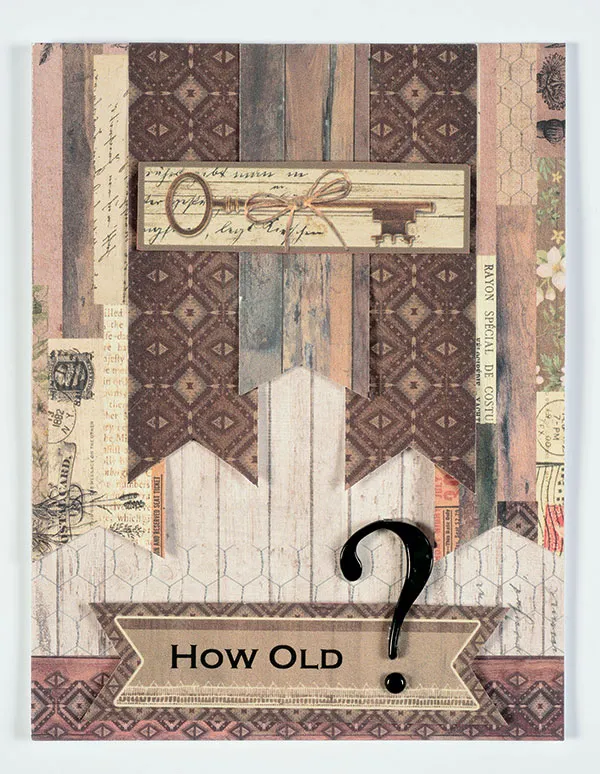 Card Front: Place the blank card with the fold on the left and cover with white wood paper with the border along the bottom. Cut out two 1¼”x5” strips of striped paper, two 1¼”x4” strips of brown tile paper, and one 1¼”x3¼” strip of brown wood paper. Cut a “V” in the end of each strip and glue on the card as shown, starting with the long/outer strips and working in. Foam tape the key die-cut as shown.
