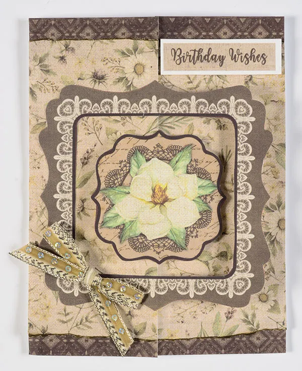 Glue the left side of the large lace frame die-cut to the left side of the card only. Foam tape the right side of the flower label die-cut on the right side of the card only. Cut a 9” length of sequin ribbon and make a bow. Zot™ the bow to the frame as shown. Trim the left side of the “Birthday Wishes” cut-out as shown and foam tape to the card.