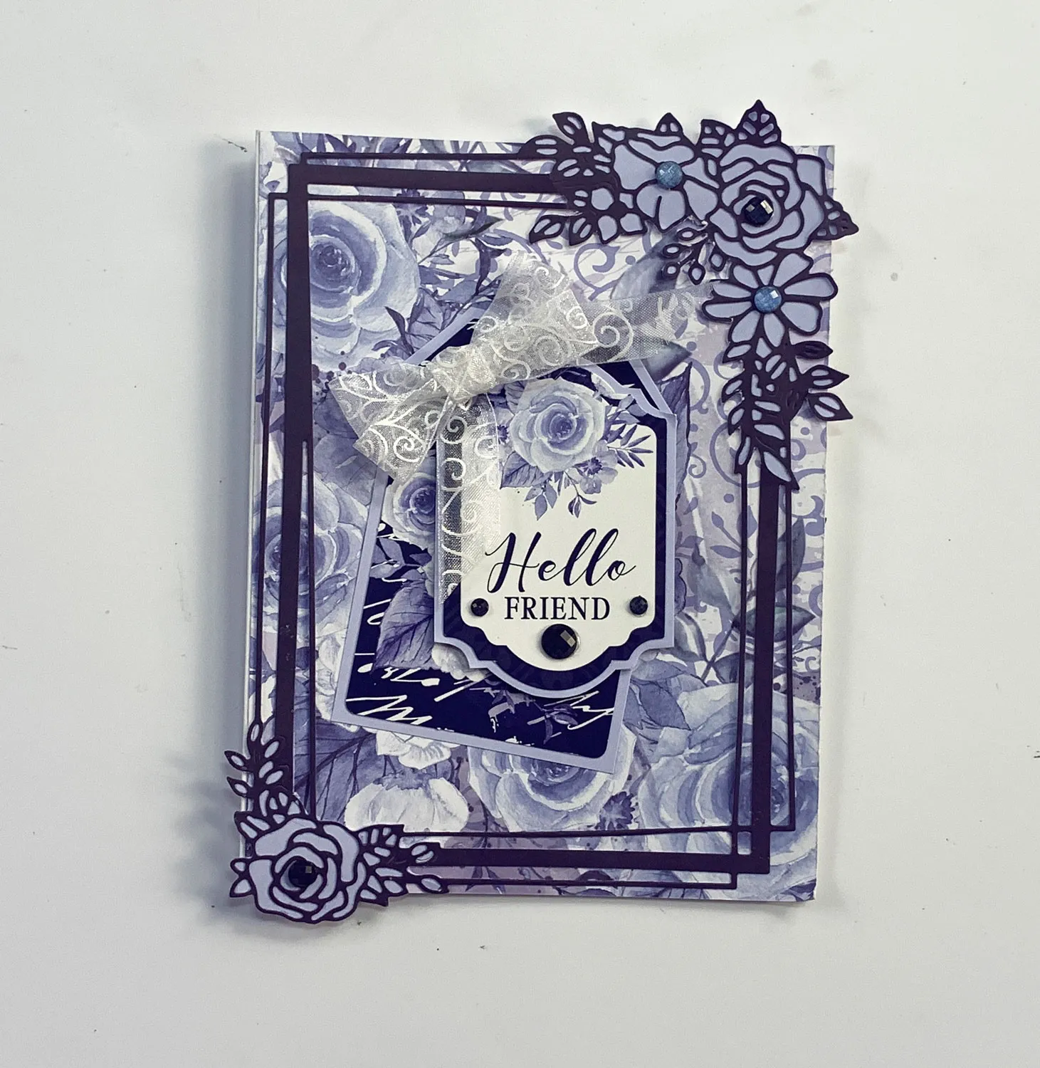 Cover the card front with Blue Persuasion Patterned Cardstock. Die cut the large frame from dark blue Blue Persuasion Solid Cardstock. Place just the rose corners of the dark blue Cardstock on the sheet of Sticky Specks then place on light blue cardstock. Trim around edges so the flowers are filled in with light blue.
