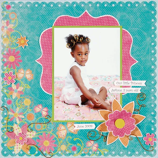 Cut a Lily Base from orange paper ad 3-D Dahlia from pink dot paper. Mat each with white cardstock and assemble according to the template instructions. Glue the Lily base to the page bottom right corner. Use foam tape to adhere the pink Dahlia flower to the center of the base. Trace small circle from the template and foam tape to the center of the flower. Cut small flower shapes from orange and pink dot papers and mat each with white cardstock. Punch yellow circles using the ¼” hole punch and glue to the flower centers. Foam tape the flowers among the large 3-D flower and those on the border.