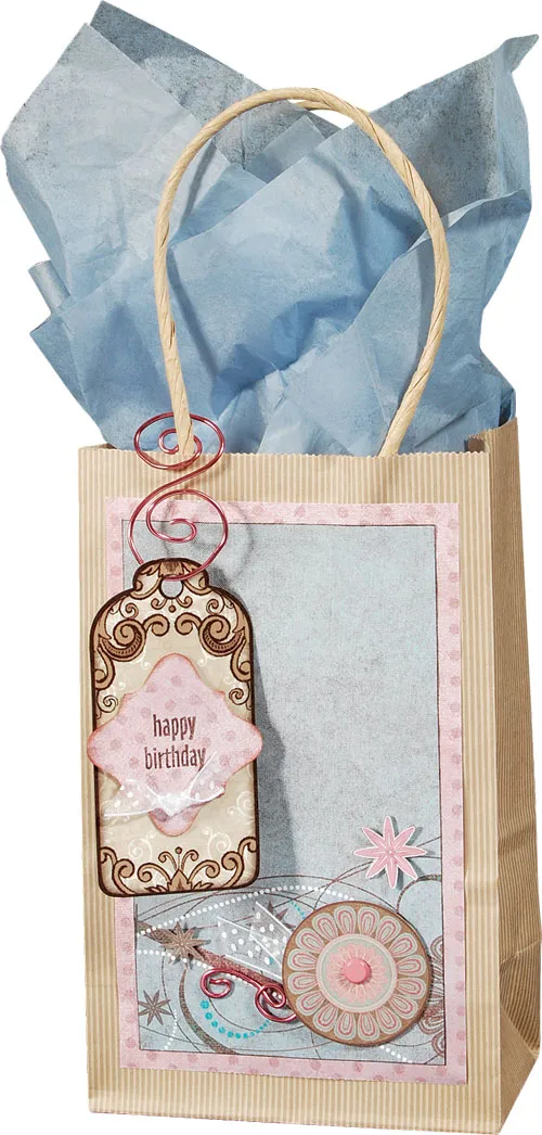 3. Tag: Create a full size pink wire swirl shape and hang from the bag handle. Punch a pink dot fancy square, ink the edges brown and stamp with “Happy Birthday.” Foam tape to the center of a brown tag. Glue a knotted length of sheer ribbon to the square punch. Hang the tag from the wire hanger.