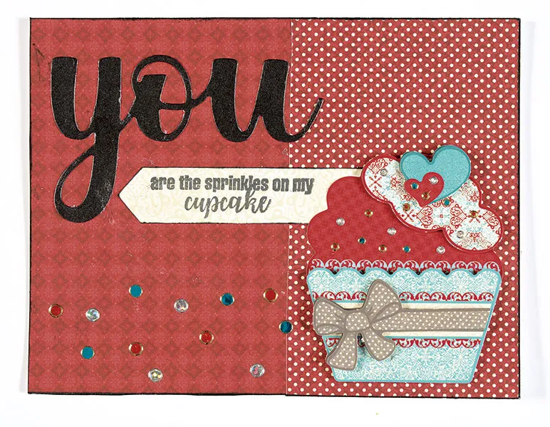 Assemble the cupcake paper tole with foam tape. Glue on the bottom right. Place Dazzles™ as shown.