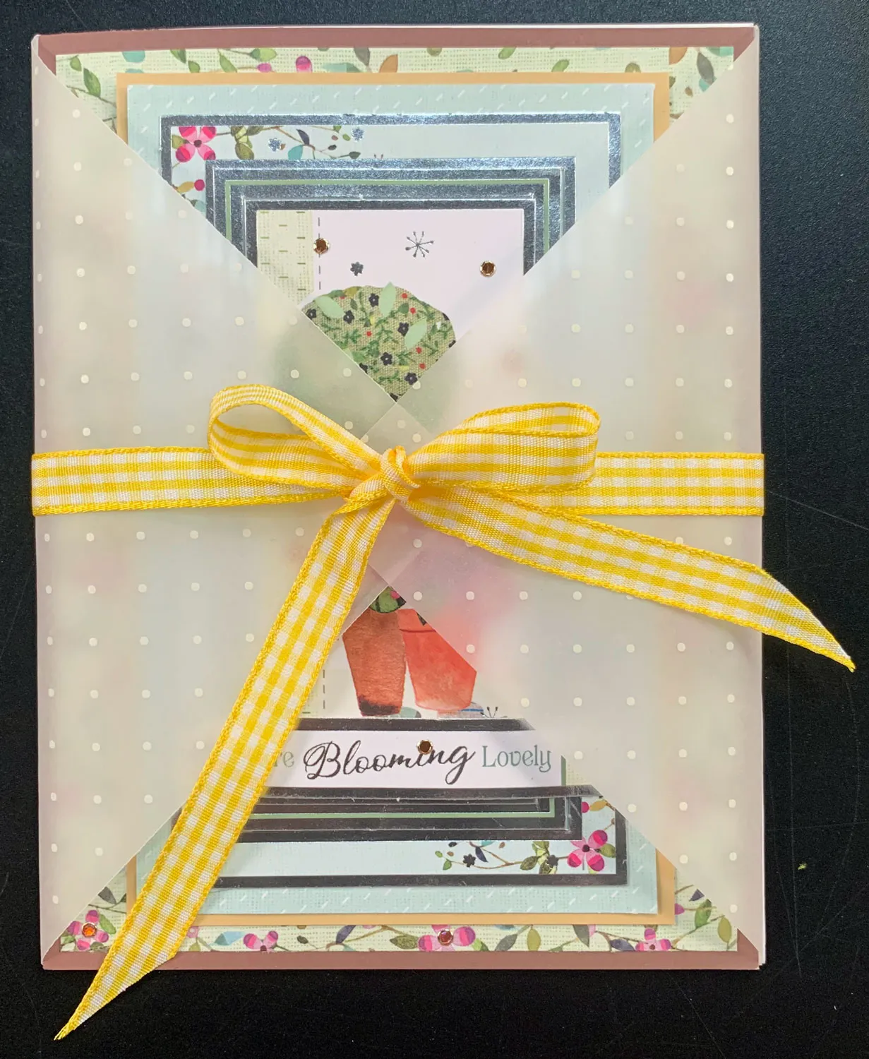 Card front: Cut 5”x6.5” brown Matt-tastic Adorable Scorable. Do not glue down at this point. Cut 4 3/8”x6 1/8” floral insert paper and glue to the brown leaving a 1/16” border. Glue the outer frame of the large topiary topper to the back side of the floral insert and cut leaving a 1/4” border. Glue the next frame inside with a single layer of foam tape. Glue the center focal with 2 layers of foam tape. Take this built piece and glue onto tan Matt-tastic Adorable Scorable with 1/8” borders. Round the sentiment with your fingers and use tiny pieces of Extra Sticky tape to attach the ends as shown. Cut 8 ¼” square of vellum. Place the card as shown and wrap the points to the front. Trim off excess vellum. Glue to the back of the brown Matt-tasting Adorable Scorable. Glue 24” of ribbon centered on the back. Glue the entire constructed piece to the card front. Fold the vellum over the card overlapping the tips and tie the ribbon into a bow.