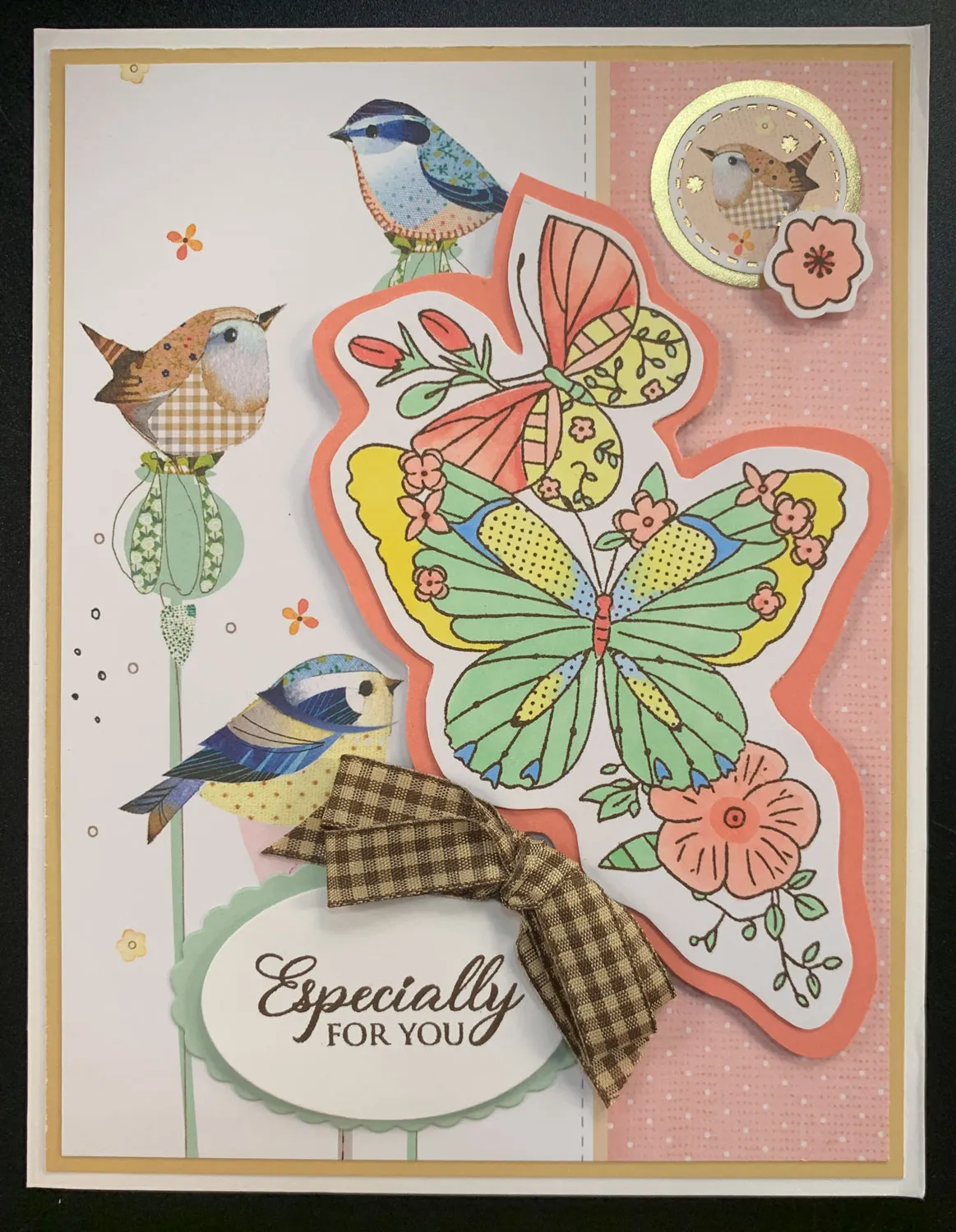 Front: Cut the birds Adorable Scorable to 4 1/2”x6” and mat on tan Matt-tastic Adorable Scorable leaving 1/16” border. Glue to the card front leaving a 1/16” white border. Stamp the butterfly spray, flower, and greeting onto white Adorable Scorable and color with Spectrum Noir Tri-blends as shown. Foam tape the stamped image as shown. Die cut the stamped sentiment with the Oval & Scalloped cutting dies. Layer and foam tape as shown. Zot™ a 2” bow.