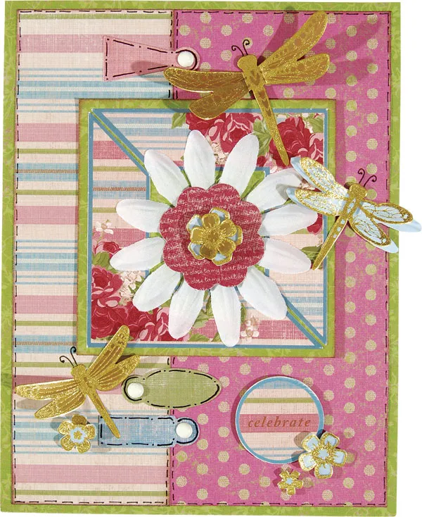 Scatter dragonflies around with small flowers. Back some with blue paper and fold up the wings and petals. Foam tape greeting with flowers.