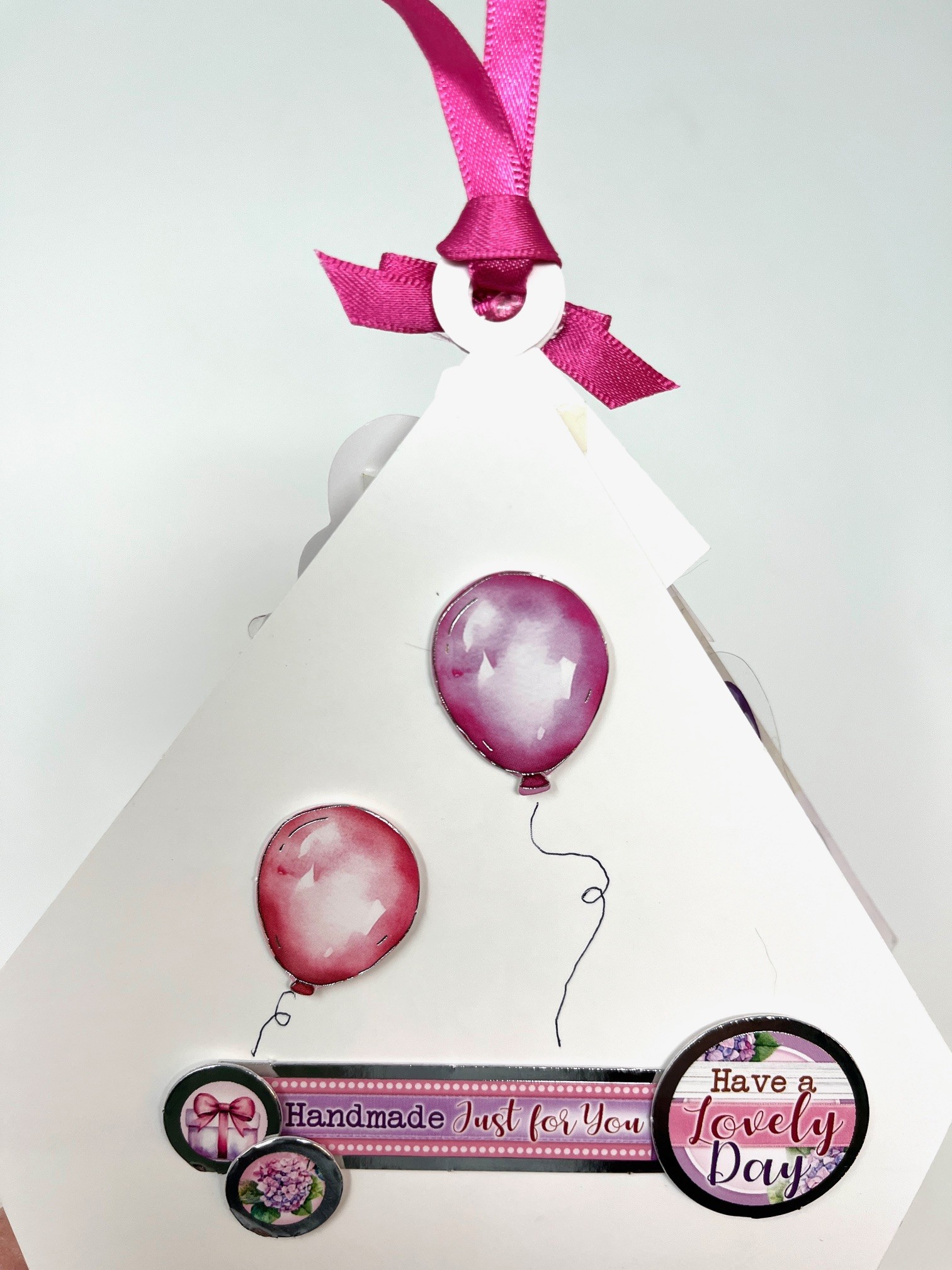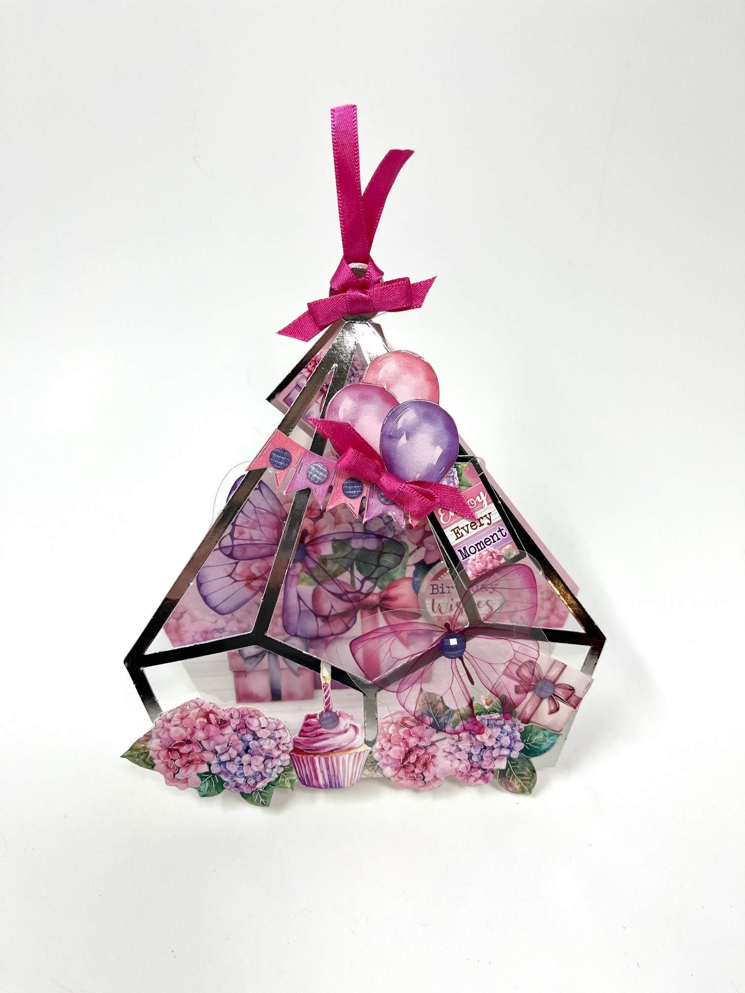 Foam tape the included “Exquisite Elements” on the front and inside as shown. Fold the acetate butterfly wings up and attach with extra sticky tape as shown. Place Diamond Sparkles as shown. Cut the included pink ribbon in half. With the front and inside held together fold pink ribbon in half and pull through top center hole part way through the hole then pull the ends through tightly. Make and Zot™️ a 1” wide pink bow from 1/4” of the remaining ribbon and place below the top knot. Make and Zot™️ another 1” wide pink bow from the other quarter placed above the tag on the outer right side of Terrarium.