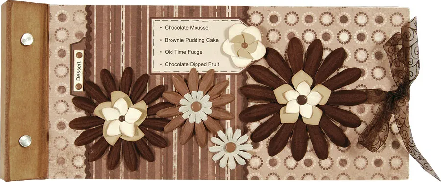 Trace and cut out flowers from the template using both sides of the tan cardstock. Ink the edges and fold. Add brads to the centers and mix with silk flowers. Foam tape to the album cover, as shown.