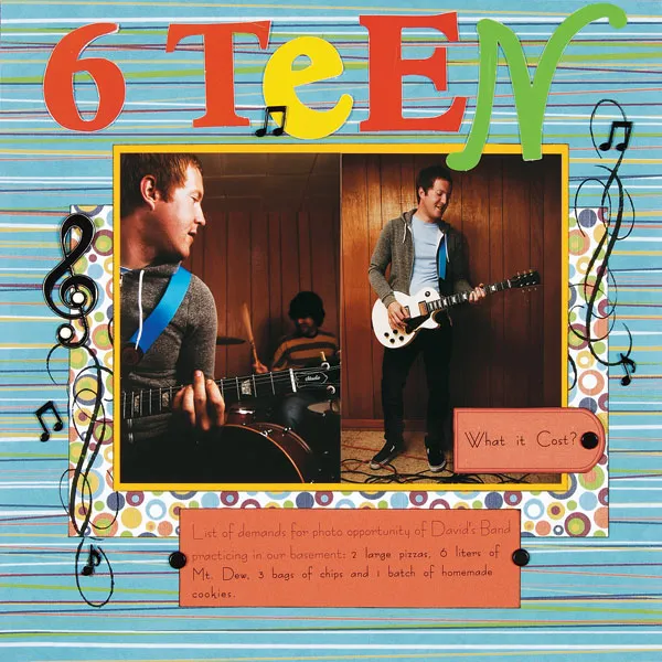 Glue another dot rectangle to the left side of the page and stamp swirls. Mat the horizontal photos with yellow cardstock. Glue over the dot mat. Sand the letters, stamp directly over them and then stamp to the left of the photos. Secure the Brad Buddy™ and music brads.