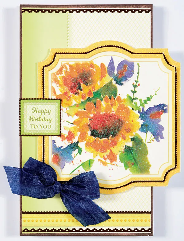 Place Brown Thin Lines Dazzles™ around the edges of the green “Happy Birthday To You” die-cut. Foam tape/glue centered on the left edge of the glittered floral die-cut. Place Brown Thin Lines Dazzles™ across top and bottom of the card panel as shown. Use 3/4" wide dark blue crepe ribbon to tie a bow. Zot™ the bow on the card as shown.
